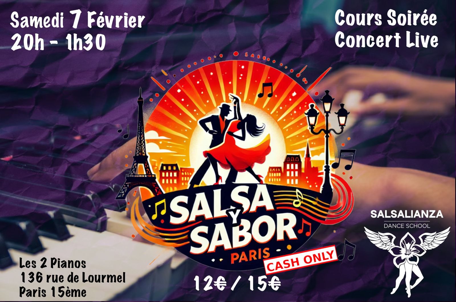 La saison continue !Après quatre soirées pleines d’énergie et de sourires, on se retrouve pour la 5ᵉ édition de votre soirée salsaToujours plus motivée, l’équipe Salsa y Sabor, en partenariat avec l’école SalsAlianza, a hâte de vous retrouver Samedi 7 Février aux 2 Pianospour un cours et une soirée 100% salsa rythmée par un concert liveet des sets DJ.